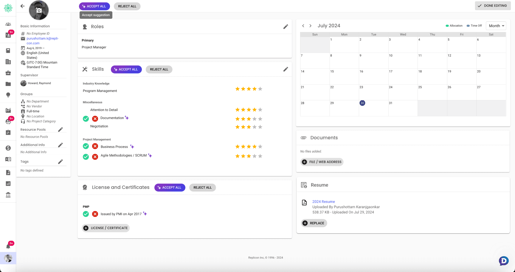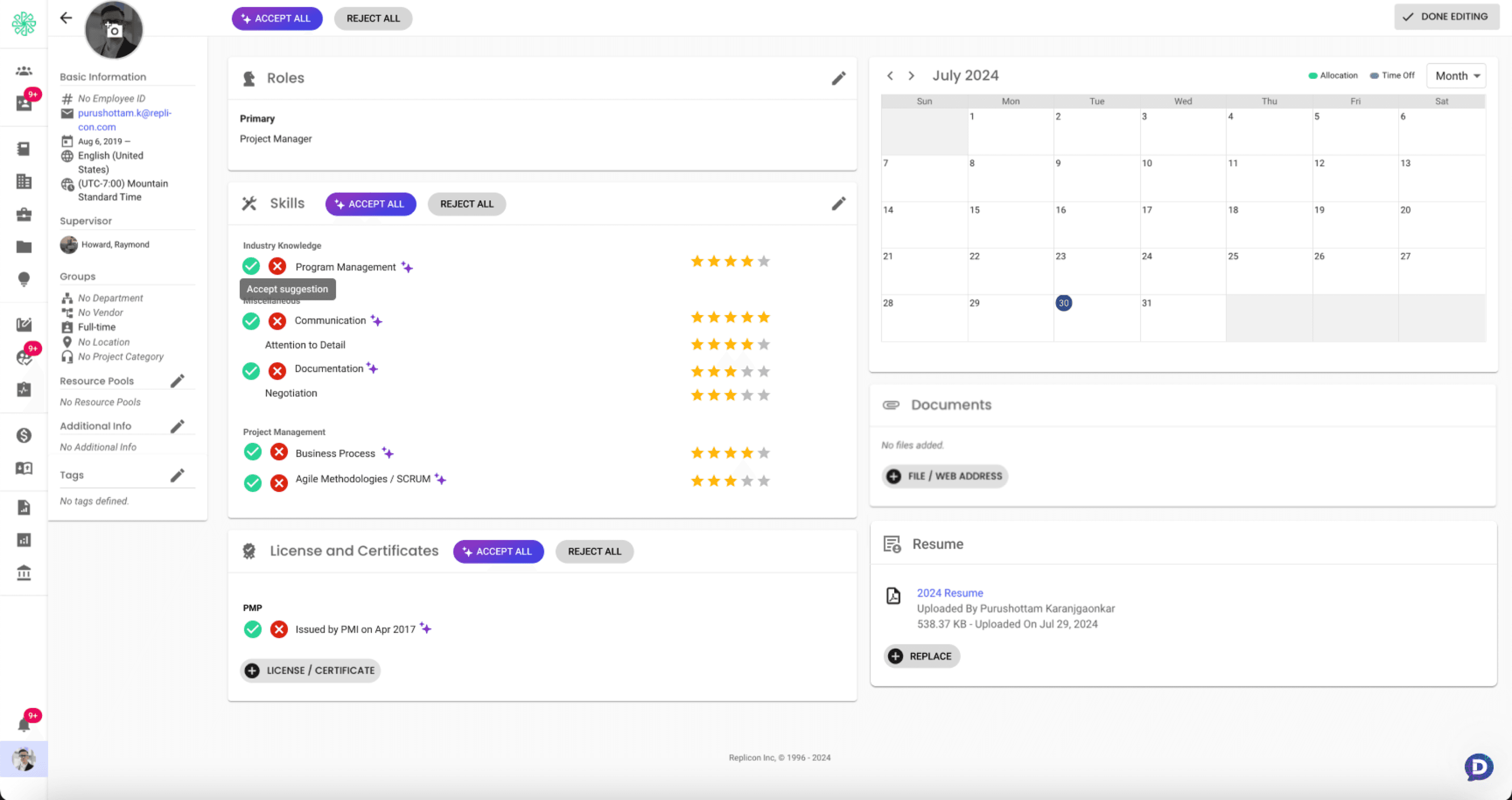 Once the resume is uploaded, our AI model pulls what it can recognize as skills and certifications. Then, the user can accept or reject all or individually. So what was previously a tedious process can be solved with a couple clicks.