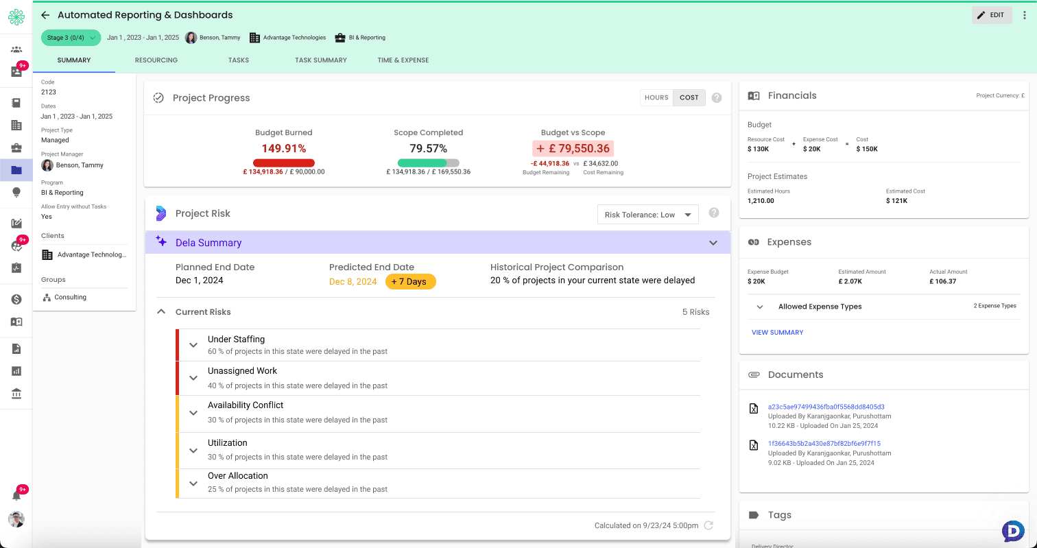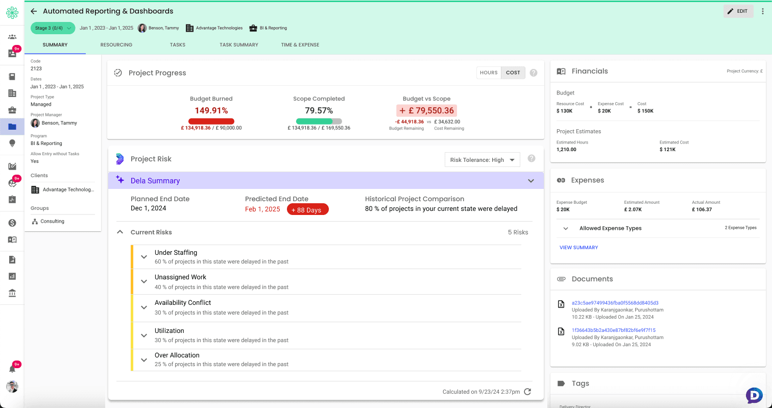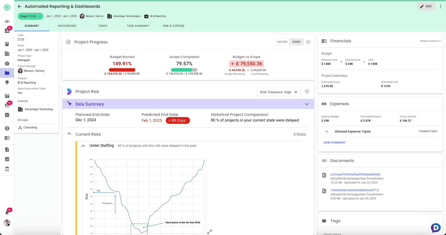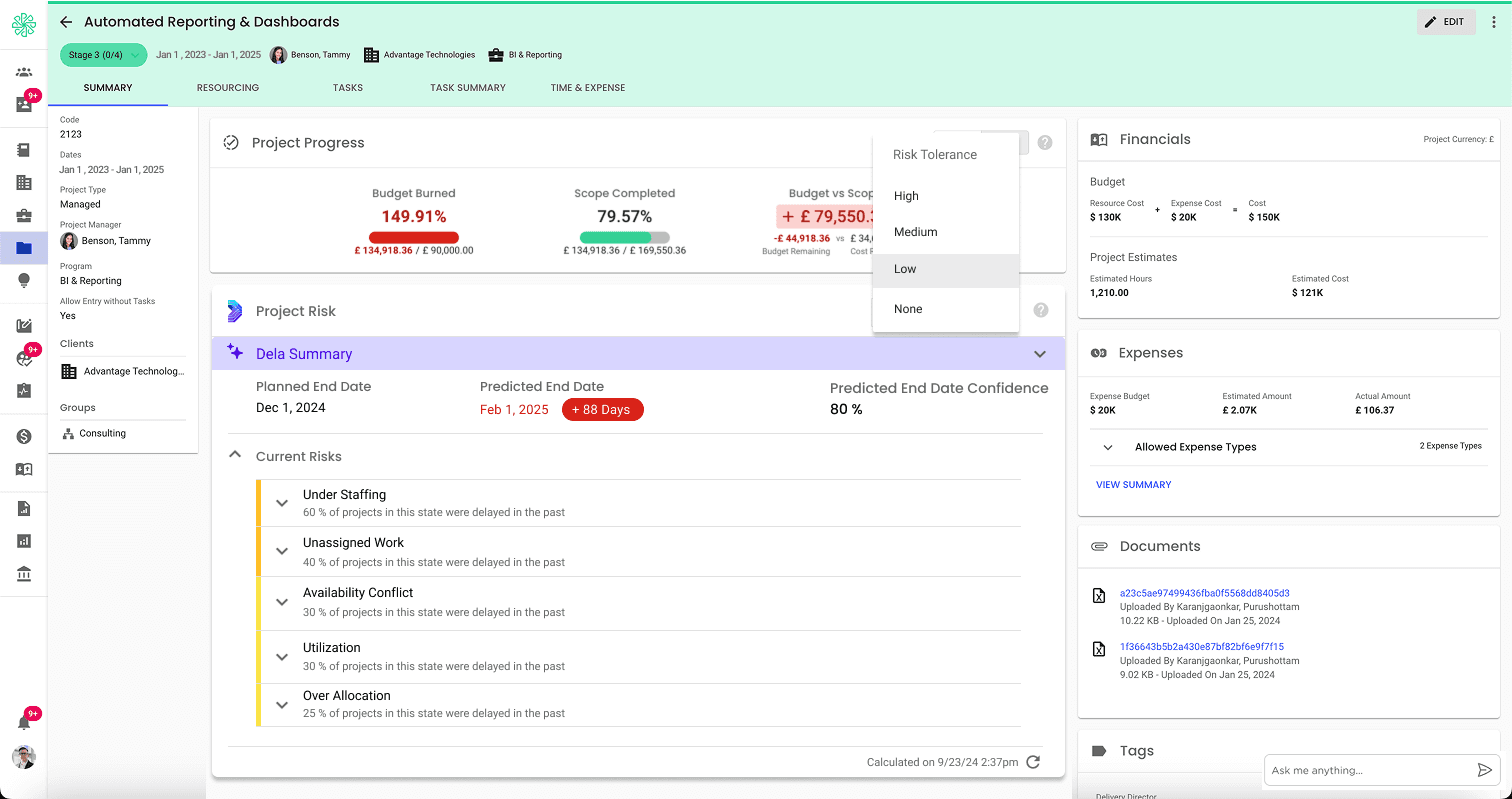 Once the PM navigated to a project, they could use the project risk card to identify what problems are currently causing potential delays as well as setting their risk tolerance. The risks and delays are driven by our AI model using historical and market data.