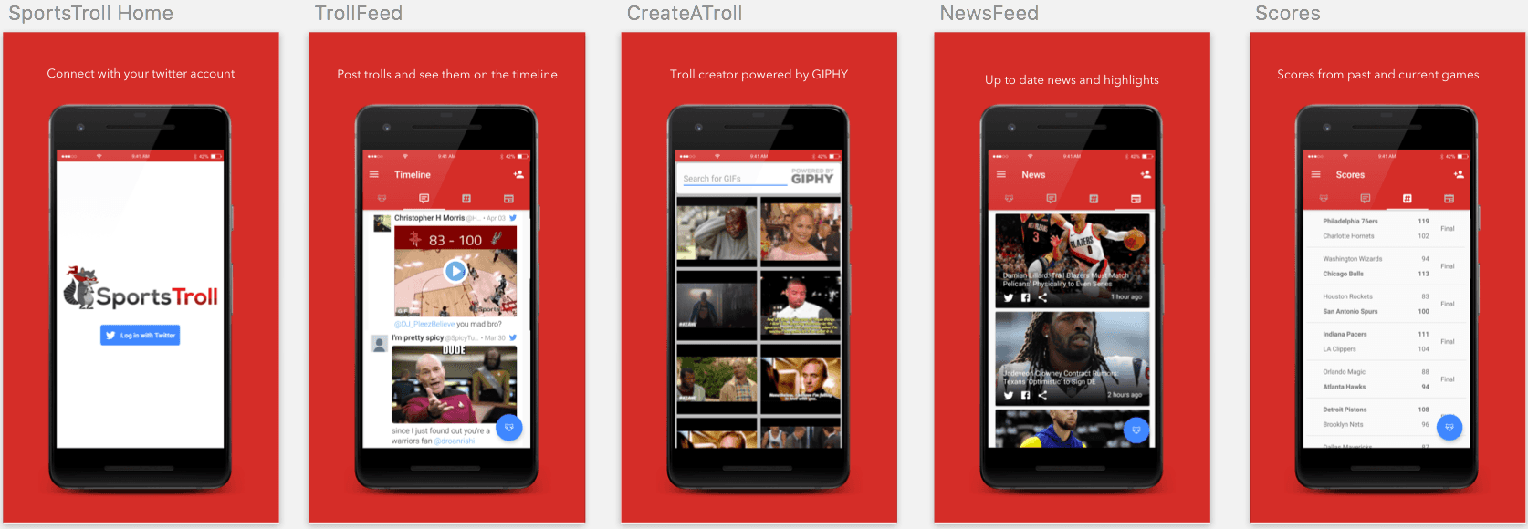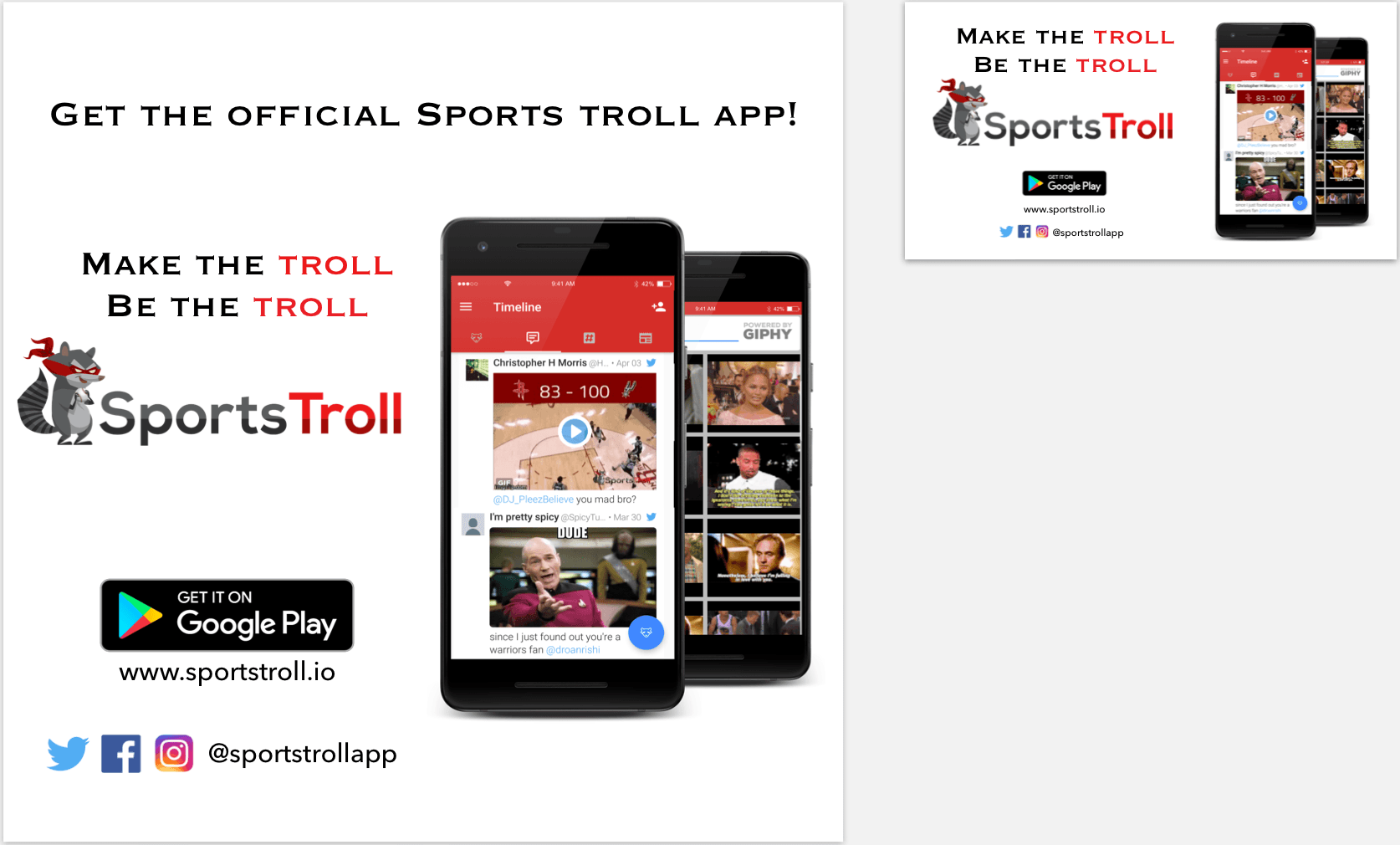 SportsTroll is an app for sports fans by sports fans. Trash talking is part of the game, and SportsTroll makes it easy. When a friend or rival's favorite team loses, it notifies you and you can send them a custom meme/gif/pic to troll. Everything is connected with Twitter.